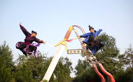 步入北大门广场,行走在武侠名著中神兵利器“倚天剑”、“屠龙刀”巍巍伫立的武侠路之上,感受《侠客行》书简中霸气凌人的气息、仰止于大宋武馆的“侠客图”之下,在十字坡“剑坛”中留下身影,饮一盏清冽的“大宋皇酒”,醉卧于龙坛之下,侠客梦想、英雄情怀,尽在于此……此外景区遍布聚贤庄及仁义侠广场表现武侠文化的各式建筑物、武林会场的猎猎飘扬的“八大门派”旗帜等,景区中武侠文化氛围无处不在。
