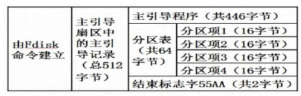 硬盘主引导记录 (MBR) , 位于硬盘的0柱面0磁头1扇区处。其包括硬盘主引导记录MBR和分区表DPT以及结束标志“55AA”[1], 这部分数据总共占512字节, 其中MBR占其中的446个字节,另外的64个字节交给了分区表DPT, 最后2个字节“55AA”是分区的结束标志。值得一提的是, MBR是由分区程序 (例如DOS的Fdisk.exe) 产生。具体结构如表1。 [4]