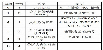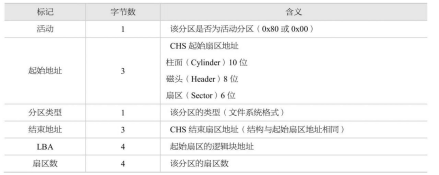 分区状态标记为活动状态时, 表示当前分区可以引导操作系统, 而非活动状态表示不能引导操作系统。分区从起始到结束地址部分均以 (H/S/C) 记录分区边界。分区起始逻辑扇区及占用总扇区数均以LBA方式表示分区范围。 [4]