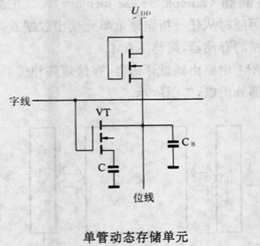 在写入数据时字线给出高电平,MOS管VT导通,位线上的电压信号经VT向电容C充电,将数据存入C中。读出时字线同样给出高电平,使VT导通,电容C经VT向位线上的寄生电容CB充电,使位线获得读出信号。