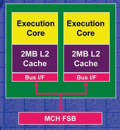 Pentium D和Pentium EE分别面向主流市场以及高端市场,其每个核心采用独立式缓存设计,在处理器内部两个核心之间是互相隔绝的,通过处理器外部(主板北桥芯片)的仲裁器负责两个核心之间的任务分配以及缓存数据的同步等协调工作。两个核心共享前端总线,并依靠前端总线在两个核心之间传输缓存同步数据。从架构上来看,这种类型是基于独立缓存的松散型双核心处理器耦合方案,其优点是技术简单,只需要将两个相同的处理器内核封装在同一块基板上即可;缺点是数据延迟问题比较严重,性能并不尽如人意。另外,Pentium D和Pentium EE的最大区别就是Pentium EE支持超线程技术而Pentium D则不支持,Pentium EE在打开超线程技术之后会被操作系统识别为四个逻辑处理器。