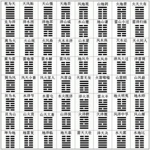 八卦符号两两相重,构成了《周易》六十四卦卦画,8×8=64。为了区分八卦之卦和六十四卦之卦,古人称八卦为“经卦”。称六十四卦为“别卦”。因此,任意两个经卦相重叠可以得一别卦。六十四卦是由八经卦相重而成。故从卦画看,一别卦由两经卦组成:居下部分称内卦(又称下体),另一部称外卦(又称上体)。