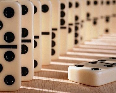 用于比喻时,多米诺骨牌效应常指一系列的连锁反应,即牵一发而动全身。在一个相互联系的系统中,一个很小的初始能量就可能产生一连串的连锁反应,人们就把它们称为“多米诺骨牌效应”或“多米诺效应”。第一棵树的砍伐,最后导致了森林的消失;一日的荒废,可能是一生荒废的开始;第一场强权战争的出现,可能是使整个世界文明化为灰烬的力量。这些预言或许有些危言耸听,但是在未来我们可能不得不承认它们的准确性,或许我们惟一难以预见的是从第一块骨牌到最后一块骨牌的传递过程会有多久。有些可预见的事件最终出现要经历一个世纪或者两个世纪的漫长时间,但它的变化已经从我们没有注意到的地方开始了。