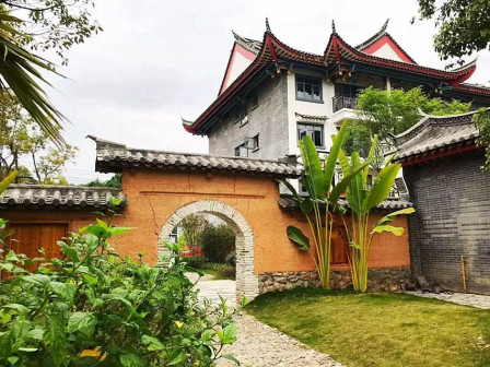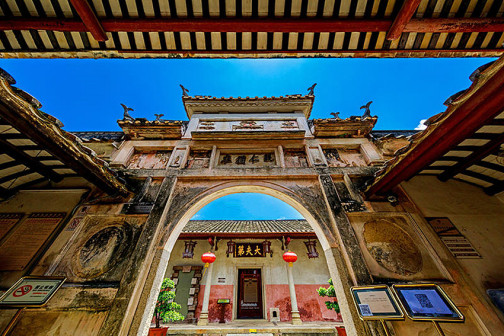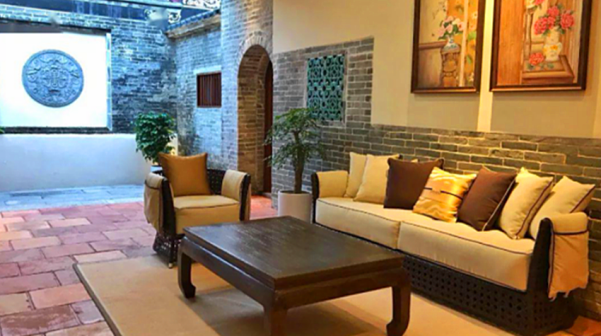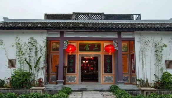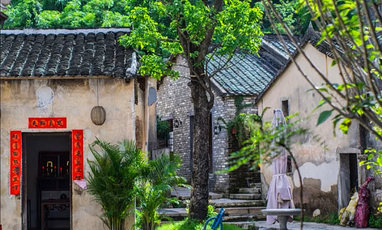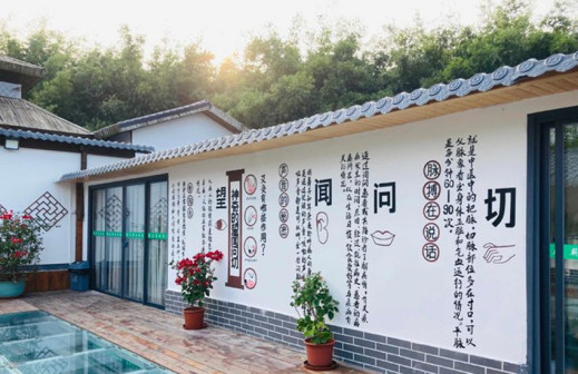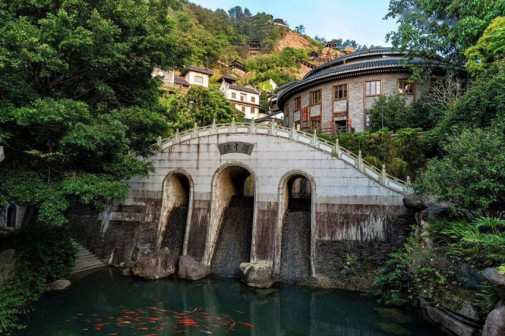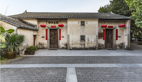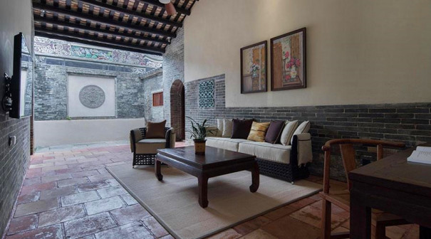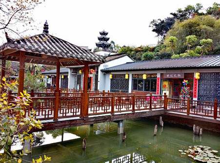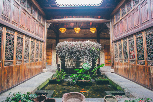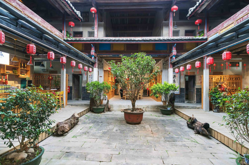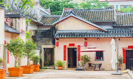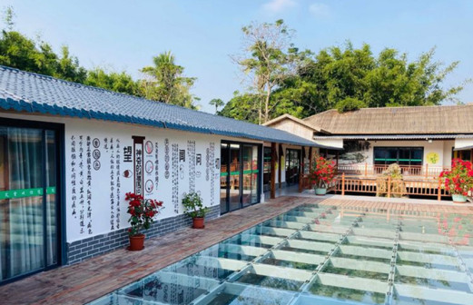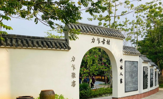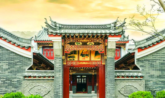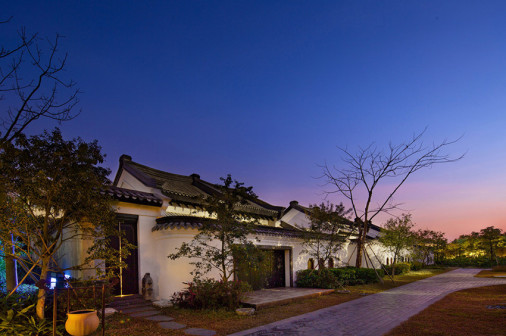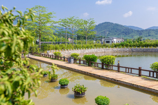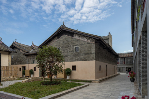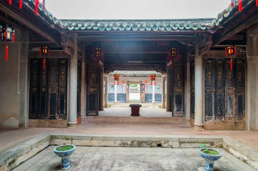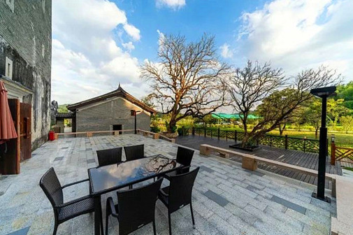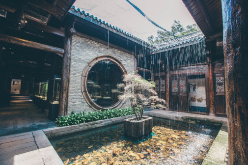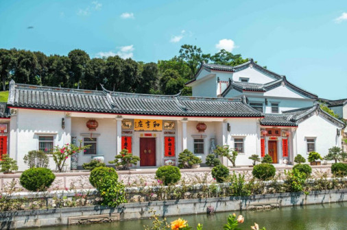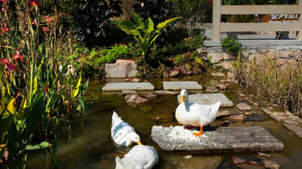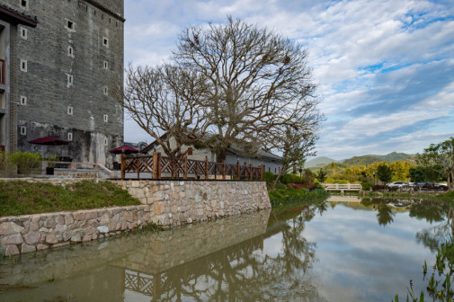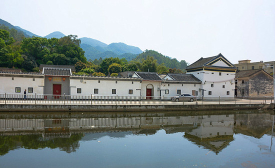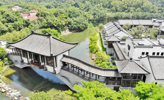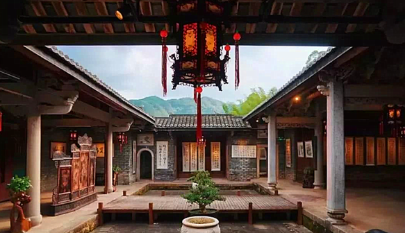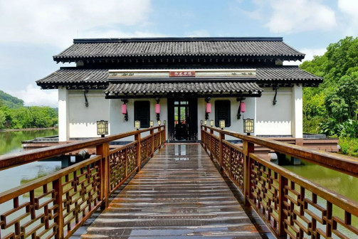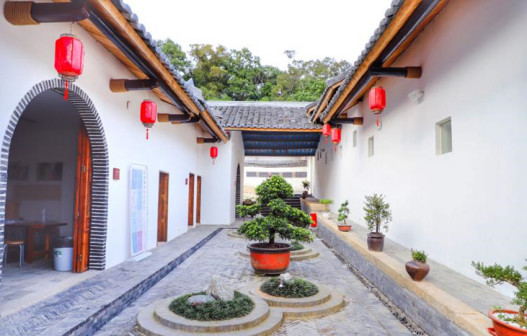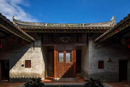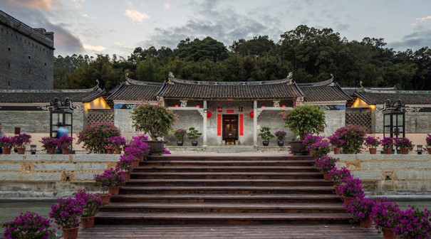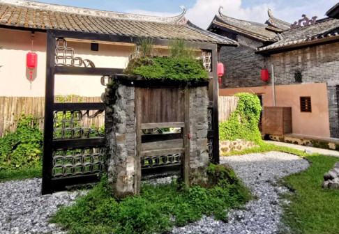客家院子沿袭典型宋制庭院风格,围绕客家人“和”“兴”“文”“美”的文化精神作为内核,以手工雕刻的泥塑画龙点睛,形成“园林包围建筑”的自然生态文化景观,传统艺术与客家建筑相互交融,有种赏心悦目的建筑美。白墙、黛瓦、翠竹、碧水,构成一幅高雅幽静的画面,行走在一步一景的客家院子,观者皆被眼前的精美设计所折服,越往里走,越能看到精工匠造 [178]。