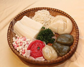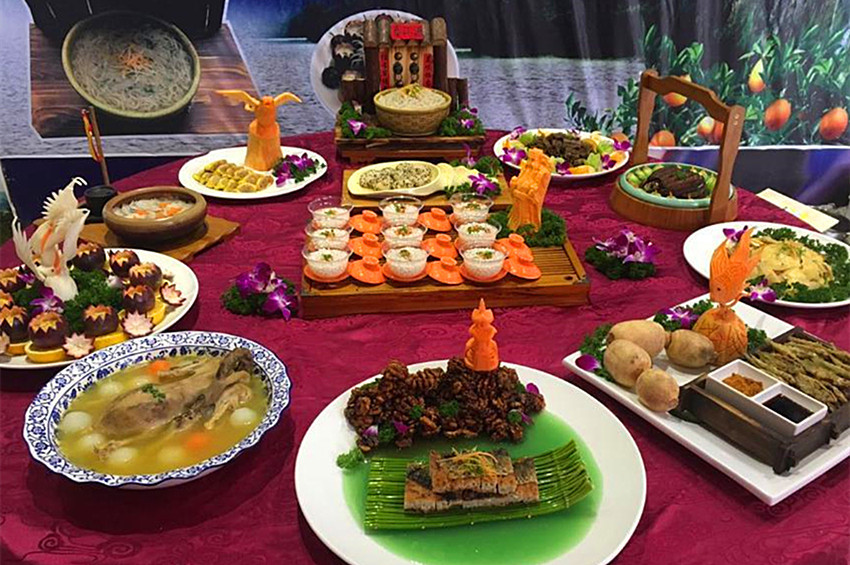客家饮食文化源远流长,唐宋时期,伴随客家民系的形成,它的雏形开始显现,赣州是客家饮食文化发祥地之一,其客家饮食文化源于中原,是中原传统文化交融的结果,它始于两晋,成熟于明清。其中的客家菜文化内涵丰厚,从用料、烹制方法到风味自成一派,其味型以鲜辣醇厚见长,清淡脆嫩兼具,烹调方法精妙考究,人文气息意蕴深远,比较符合现代“返璞归真”的观念,具有很强的生命力。四星望月、酿豆腐、小炒鱼、萝卜饺、荷包胙、凤眼珍珠、三杯鸡、肉丸子、黄元米果、鱼脯、擂茶等风味独特,美味可口,是享誉海内外的客家美食 [176]。
