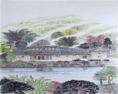 穿越万顷碧波,在深圳这座奇迹般崛起的城市,那瞬间凝固的是摩肩接踵的人群和高楼林立的现代化城市景象。就在这块版图的中北部,有一方钟灵毓秀的山水,龙华区观澜版画基地,那里仍保存着水塘、古井、宗祠、碉楼等客家村落的遗迹,呈现了一幅田园式的原生态美妙图画 [162]。