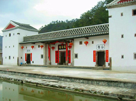 客家民居建筑有较多讲究,营造前必按“左青龙,右白虎,前朱雀,后玄武”的理想格局,踏勘选址。根据“涉水藏凤”的要求“觅龙”、“察砂”、“观水”、“点穴”,由大的四境到具体界址,分步确定居住的方位朝向,最后选好吉日时辰立“泰山石敢当”,开工动土。房屋结构分前后栋,中间设天井,中轴设正厅,其余的叫偏厅或横厅,房间均为二层,楼上供储藏之用,楼下为卧室或书房。门前一般有一块大的场地,称为“禾坪”,供晒物之用 [159]。