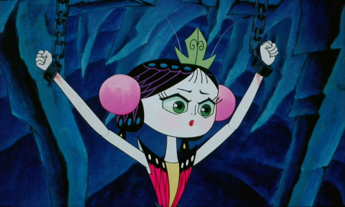 之后小蝴蝶发现葫芦小金刚想残害那只每天给自己送水送饭的瘸腿老蟾,于是求情并与之谈判,用自己作为交换代价,救了瘸腿老蟾。 [7]葫芦小金刚却看见小蝴蝶受苦受难的惨状,不忍伤害对方,询问她因何而有此遭遇,于是小蝴蝶向葫芦小金刚陈述了自己如何被青蛇大王罚到牢里受苦的原因,葫芦小金刚解除了小蝴蝶手上的锁链,却砸不开其腰上的魔爪金箍,并且越砸越紧,只会让小蝴蝶更加痛苦。 [8]葫芦小金刚答应铲除青蛇大王救其脱困此处,身后的青蛇精听见大怒,准备一剑砍死小蝴蝶,却被葫芦小金刚挡住并再次搏斗起来。 [9-10]