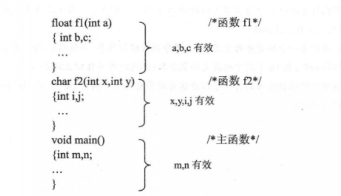 在函数f1内定义了三个变量,a为形参,b、c为一般变量。在fl的范围内a、b、c有效,或者说a、b、c变量的作用域限于f1内。同理,x、y、i、j的作用域限于f2内。m、n的作用域限于main函数内。关于局部变量的作用域还要说明以下几点: