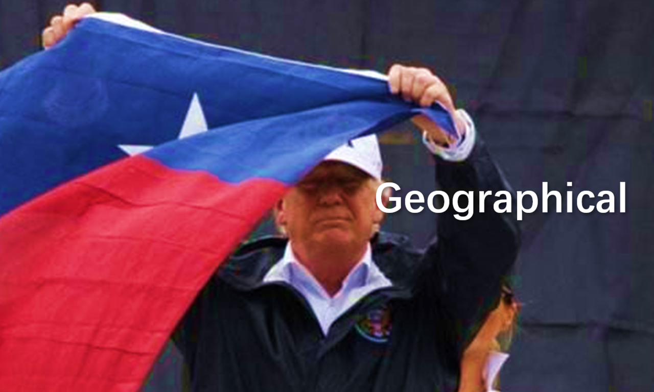 该州可区分为四个主要地理区域:西湾沿岸平原区、北部中央平原区、大平原区、以及佩科斯区。得州东南方有三分之一的地区属于西湾沿岸平原;北部中央平原区由得州的中部一直向东半部的狭长地带(Panhandle)延伸,基本上是一些没有树木生长的山丘及山谷。大平原区位于北部中央平原区的西边,是属于一直延伸到加拿大的大草原的一部分。佩可斯区位于得州的西部,是一处风景壮丽、由岩石构成的干燥地区。