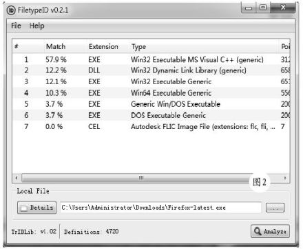 对于一般的扩展名,我们可以清楚地知道其文件类型,但是对于不常见的扩展名,或者没有扩展名的文件来说,想识别其真实身份,就不那么简单了。使用FileTypeID这款小工具,问题就可迎刃而解。FileTypeID可以识别几千种文件类型,运行该程序,将未知类型的文件直接拖放到该程序主界面中,点击“Details”按钮,可以显示该文件的详细信息,如图1所示。点击“Analyze”按钮,在识别列表中的“Extension”列中显示该文件可能归属的文件类型,在“Match”列中显示与该文件类型匹配的几率,在“Type”列中显示该文件的类型描述信息,根据这些信息,就不难发现其真实身份了。 [2]