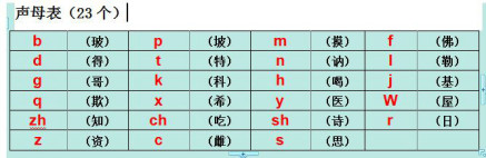 汉语拼音 | b | p | m | f | d | t | n | l | g | k | h |