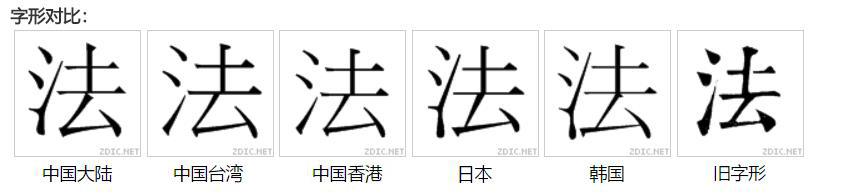 《玉篇》:古文法字。注详五画。《说文》:刑也。平之如水,故从水。廌所以触不直者去之,故从廌从去。《周礼·天官·太宰》以八灋治官府。