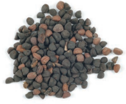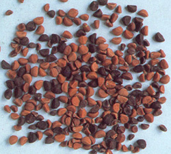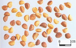 成熟种子。种子呈卵形,多呈圆球形的1/4状,长4~6 mm,宽3~5 mm。表面灰褐色,披金黄色鳞片的非腺毛,脱落处粗糙,呈小凹点状,背面弓形隆起,中央有浅纵沟,腹面为一棱线,种脐明显,在棱线及背面交接处呈缺刻状。质硬,横切面淡黄色,可见2片皱缩折叠的子叶。无臭,味微辛辣。分布于吉林、山西、陕西等省。在东北、内蒙古及浙江部分地区误作牵牛子用。