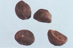 牵牛子种子似橘瓣状,略具3棱,长5至8毫米,宽3至5毫米。表面灰黑色(黑丑)或淡黄色(白丑),背面有一条浅纵沟,腹面棱线的下端有1种脐。质硬,横切面淡黄绿色,子叶皱缩折叠,显油性,有明显粘液,气微,味辛、苦,有麻舌感。以颗粒饱满,无果皮等杂质者为佳。