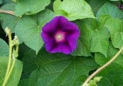 裂叶牵牛Pharbitis nil(L.)choisy.为1年生缠绕性草本。茎左旋,长2 m以上,披倒向的短柔毛及杂有倒向或开展的长硬毛。叶互生;叶片宽卵形或近圆形,深或浅3裂,偶有5裂,基部心形,中裂片长圆形或卵圆形,渐尖或骤尖,侧裂片较短,三角形,裂口锐或圆,叶面被微硬的柔毛。花腋生,单一或2~3朵着生于花序梗顶端,花序梗长短不一,披毛;苞片2,线形或叶状;萼片5,近等长,狭披针形,外面有毛;花冠漏斗状,长5~10 am,蓝紫色或紫红色,花冠管色淡;雄蕊5,不伸出花冠外,花丝不等长,基部稍阔,有毛;雌蕊1,子房无毛,3室,柱头头状。蒴果近球形,3瓣裂。种子5~6颗,卯状三棱形;黑褐色或米黄色。