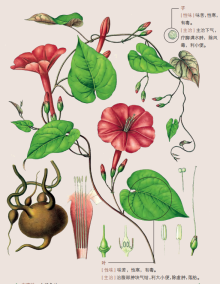 牵牛子味苦,性寒;有小毒。有泻水,下气,驱虫的功效。用于水肿,喘满,痰饮,脚气,虫积,大便秘结等疾病。 [7]