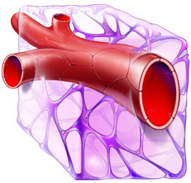 编辑动脉起自心脏,不断分支,口径渐细,管壁渐薄,最后分成大量的毛细血管,分布到全身各组织和细胞间。毛细血管再汇合,逐级形成静脉,最后返回心脏。动脉和静脉是输送血液的管道,毛细血管是血液与组织进行物质交换的场所,动脉与静脉通过心脏连通,全身血管构成封闭式管道。人体内血管分布常具有对称性,并与机能相适应,大的血管走向多与身体长轴平行,并与神经一起被结缔组织膜包裹成血管神经束。