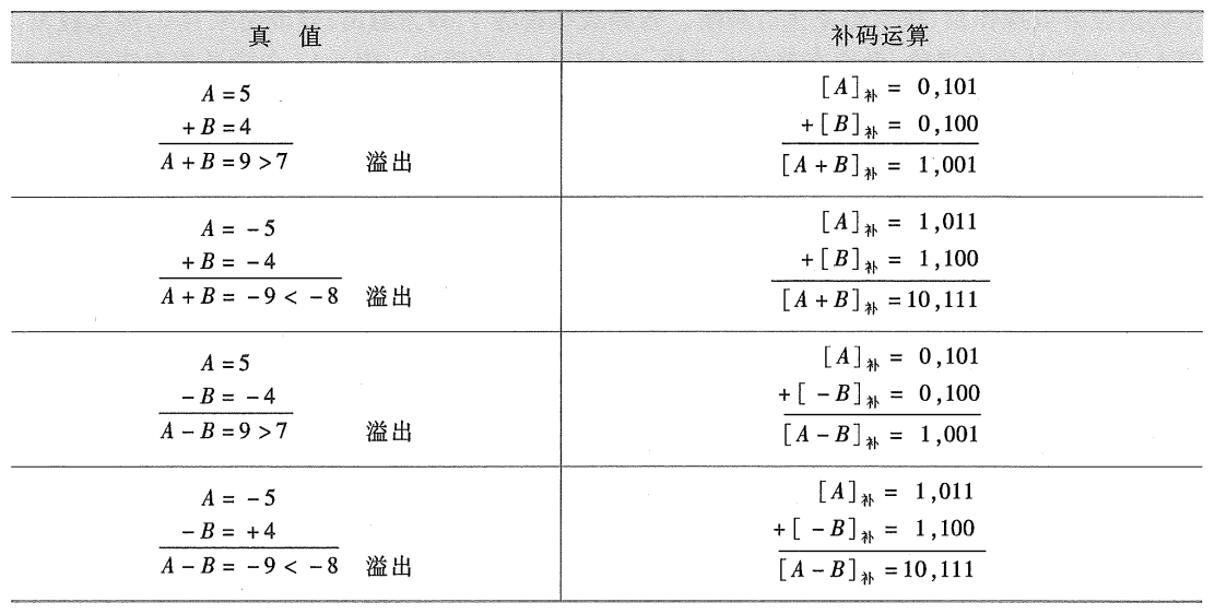 机器字长为4位的补码所对应的真值范围为[-8,+7],运算结果一旦超过这个范围即为溢出。下图列出了四种溢出情况。 [6]