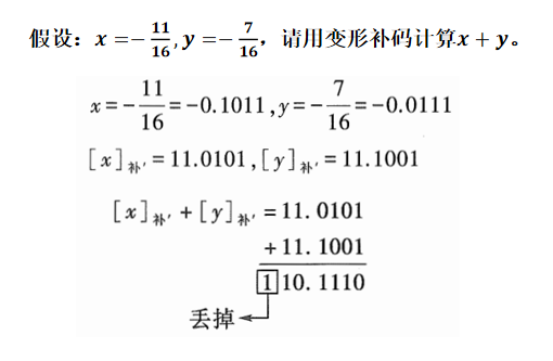 当使用补码表示数字时,如果采用2位符号位,则称为变形补码。在用变形补码作加法时,2位符号位要连同数值部分一起参加运算,而且高位符号位产生的进位自动丢失,便可得正确结果,变形补码判断溢出的原则是:当2位符号位不同时,表示溢出,否则;无溢出。不论是否发生溢出,高位(第1位)符号位永远代表真正的符号。 [6]