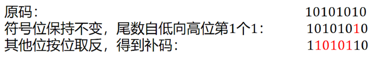 对于负数,通过数学公式求补码的过程较为复杂,不利于在计算机中的实现,有两种更简便实用的转换方法。