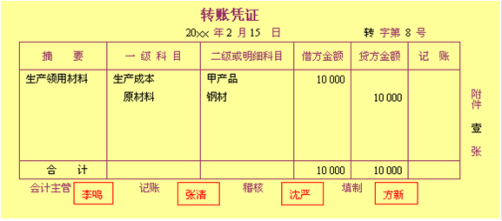 转账凭证将经济业务事项中所涉及全部会计科目,按照先借后贷的顺序记入“会计科目”栏中的“一级科目”和“二级及明细科目”,并按应借、应贷方向分别记入“借方金额”或“贷方金额”栏。其他项目的填列与收、付款凭证相同。
