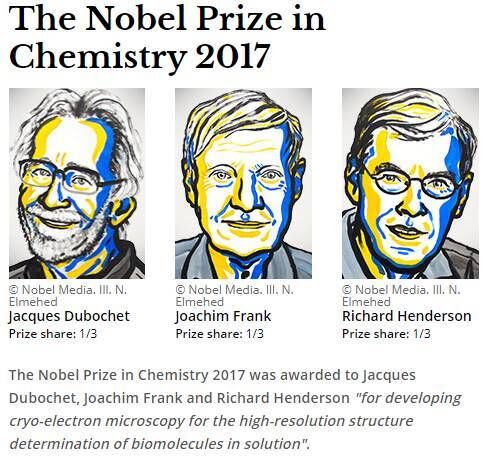 | 2017年 | 雅克·杜波切特 | 瑞士 | 洛桑大学(瑞士) | 开发冷冻电子显微镜用于溶液中生物分子的高分辨率结构测定 |