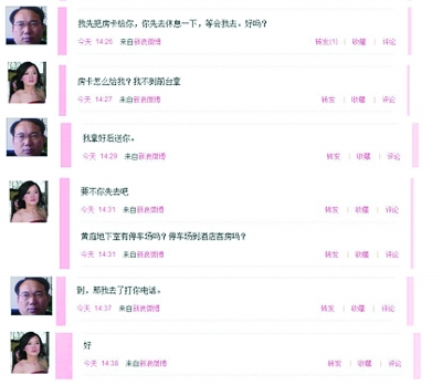 之所以向“Y珍爱一生Y”汇报自己的工作状态,原来19日上午一大早,女主角就在微博上呼唤,:“亲爱的胖胖,我去天目湖了你有时间给我电话吧!” 在一来一去回复之后,20分钟左右的时间,两人互发微博十几条,很快达成一致,下午两人约在黄庭酒店开房。而因为男主角工作繁忙,两人商定,由“为了你5123”先去酒店拿房卡给“Y珍爱一生Y”,之后“Y珍爱一生Y”先上去休息一下,过会“为了你5123”再去。