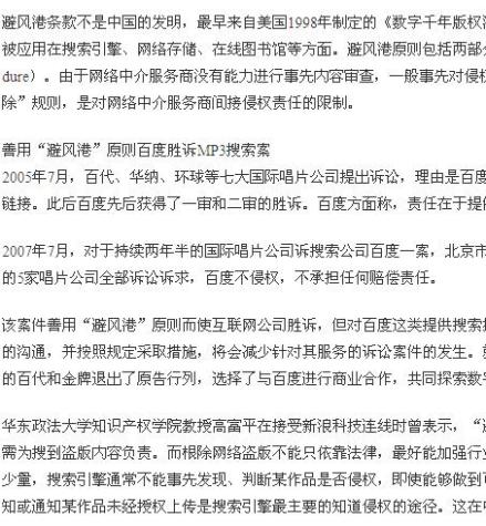 2006年7月1日,《信息网络传播权保护条例》(简称《条例》)正式施行,网络“高速公路”上包括信息的发布、传达、引用等一系列问题都将得到更进一步的规范,同时,《条例》也明确规定了信息网络传播权领域的“避风港”原则。其中《条例》第14条/23条,参考国际通行做法,建立了处理侵权纠纷的“通知与删除”简便程序。大大减少了搜索引擎公司承担法律责任的概率。