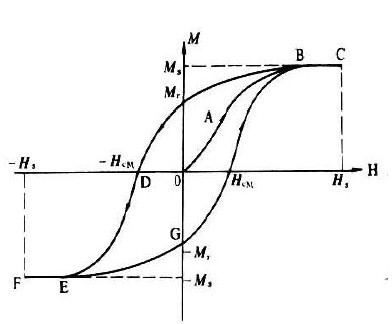 和铁电体一样,铁磁性材料的磁化强度与外磁场呈非线性关系。这种关系是一条闭合曲线,此曲线线称为磁滞回线(如图1)。一般来讲,铁磁体等强磁物质的磁化强度M或磁感应强度B不是磁场强度H的单值函数而依赖于其所经历的磁状态历史。以H=M=B=0为起始状态,当磁化曲线由OABC到C点时,此时磁化强度趋于饱和,记为Ms。若减小磁场,则从B电开始M随H的变化偏离起始磁化曲线,M的变化落后于H。当H减小至零时,M不为零,而等于剩余磁化强度Mr。为使M为零,需加一个反向磁场,即为磁矫顽场Hc。继续增大反向磁场至-Hs时,磁化强度M将沿反方向磁化至-Ms。曲线BDEGB即为磁滞回线。 [2-3]