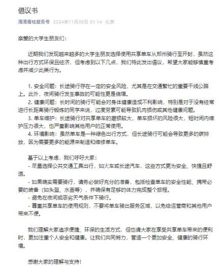 2024年11月9日,美团单车、哈啰单车、青桔单车运营公司发布郑州共享单车使用联合公告: