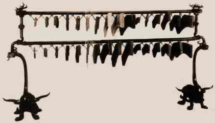 据史料记载 [2],在夏代已经有用鳄鱼皮蒙制的鼍鼓。商代已经发现有木腔蟒皮鼓和双鸟饕餮纹铜鼓,以及制作精良的脱胎于石桦犁的石磐。青铜时代影响所及,商代还出现了编钟、编铙乐器,它们大多为三枚一组。各类打击乐器的出现体现了乐器史上击乐器发展在前的特点。始于公元前五千余年的体鸣乐器陶埙从当时的单音孔、二音孔发展到五音孔,它已可以发出十二个半音的音列。根据陶埙发音推断,中国民族音乐思维的基础五声音阶出新石器时代的晚期,而七声至少在商、殷时已经出现。