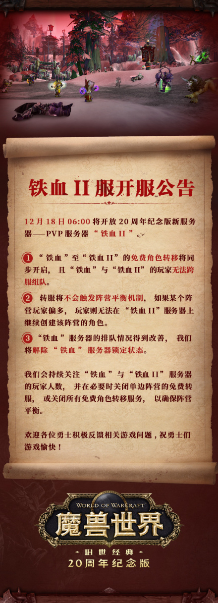 2024年12月17日晚间,《魔兽世界》官方运营团队发布公告称,近期观察到铁血服存在人数过多导致服务器出现排队,严重影响玩家游戏体验的情况。运营团队就此问题紧急与暴雪团队展开沟通并进行了技术评估,决定将于12月18日06:00,正式开启铁血II(PVP)服务器。 [72]