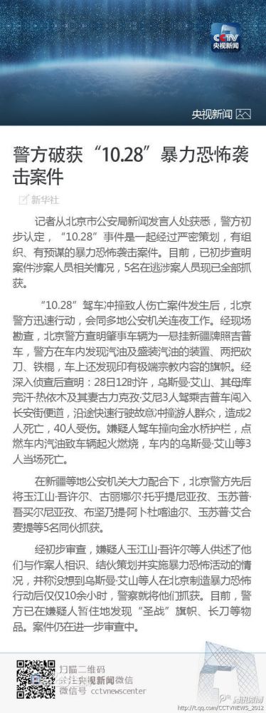 CNN:美国有线电视新闻网(CNN)的官方网站日前刊文,评北京天安门广场上周一发生的吉普车碾轧行人和冲撞金水桥事件。文章回顾了中国政府对新疆维吾尔族的“压制”,并且质疑中国警方对这起事件的定性,公开提出这件事究竟“是一起精心准备的恐怖袭击,还是一个挣扎在中国巨大发展机器边缘的民族仓促组织的绝望呐喊”。