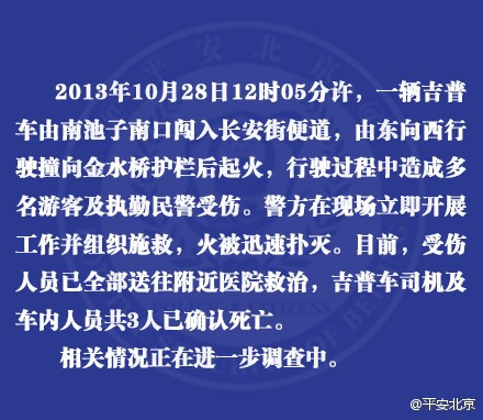 2013年10月31日,外交部发言人华春莹在例行记者会上表示:北京市公安局公布了“10·28”事件初步调查结果。警方初步认定,28日发生在天安门金水桥的针对无辜平民和游客的暴力恐怖袭击是一起经过严密策划,有组织、有预谋的暴力恐怖袭击案件。这种针对无辜的平民和游客的暴力恐怖袭击是反人类、反社会、反文明的行径,任何有良知的人都会齐声对此予以强烈的谴责。 [9]