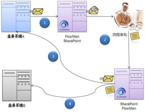 业务系统集成 — 当企业各个业务系统中进行的关键流程如订单、报价处理、采购申请、合同审批、公文收发、客户电话处理、供应链管理等需要进行审批、协同时,可以将业务数据通过Web Service接口写入SharePoint平台,从而触发由吉流(FlowMan)定义的工作流程。所有参与流程用户的审批和监控操作均在SharePoint平台上完成。流程的中间结果和最终结果同样可以通过Web Service接口写入相关的业务系统中。