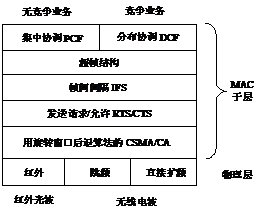 802.11的超帧设计,分别定义了支持同步业务以及时限业务的无竞争方式和支持异步业务的竞争方式。无竞争方式就是中心协调方式(PCF,PointCoordinationFunction)。PCF方式中将时间域划分为各个超帧,在无竞争期采用与光纤分布式数据接口(FDDI,FiberDistributedDataInterface)LAN类似的主控站(AP)轮询,某个时刻允许某个站点发送;在竞争期,则采用CSMA/CA方式,即分布协调方式(DCF,DistributedCoordinationFunction)。时限业务对实时数据和话音业务至关重要。