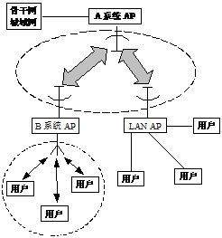 实际上,当时IEEE802.11定义时考虑了分层WLAN的想法,即上层为可与高速骨干网或城域网连接的IEEE802.11a系统(简称A系统),下层为IEEE802.11b系统(简称B系统)或普通有线LAN。其关系可以用图2来描述。
