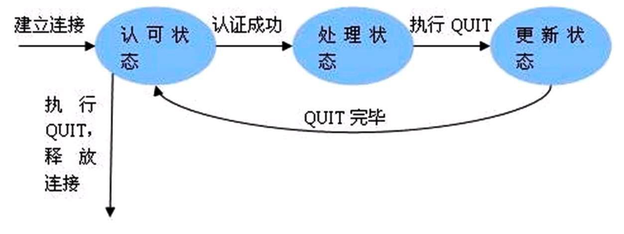 认证状态,处理状态和更新状态。当客户机与服务器建立连接时,客户机向服务器发送自己身份(这里指的是账户和密码)并由服务器成功确认,即客户端由认可状态转入处理状态,在完成列出未读邮件等相应的操作后客户端发出quit命令,退出处理状态进入更新状态,开始下载未阅读过的邮件到计算机本地之后最后重返认证状态确认身份后断开与服务器的连接。具体原理如下图
