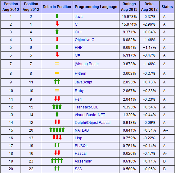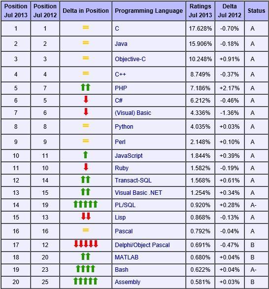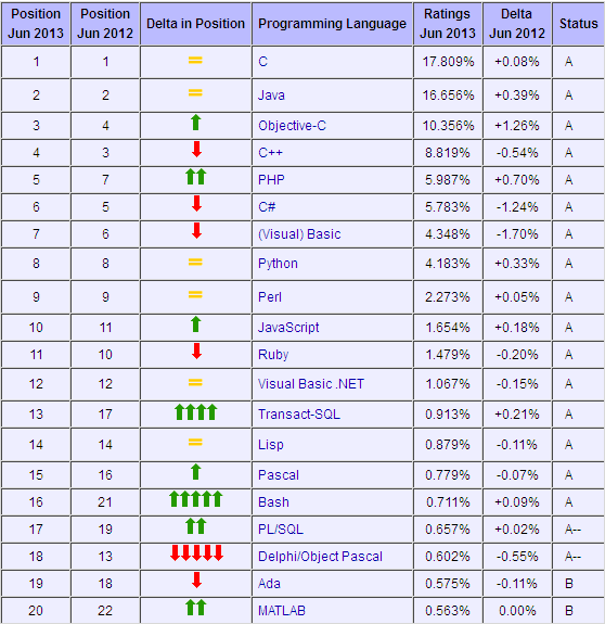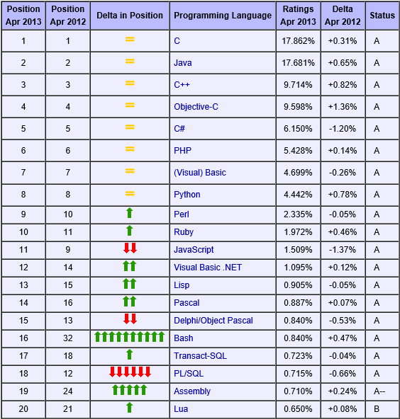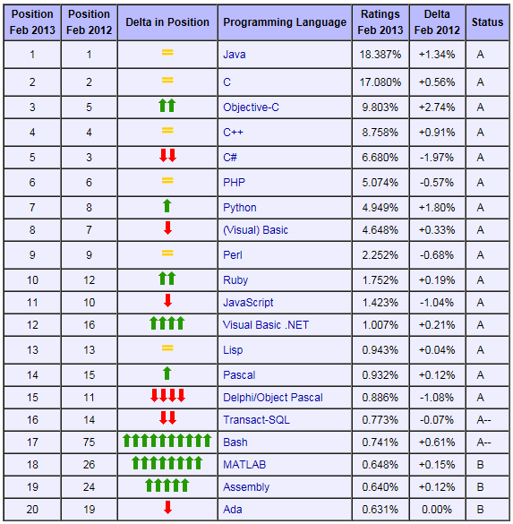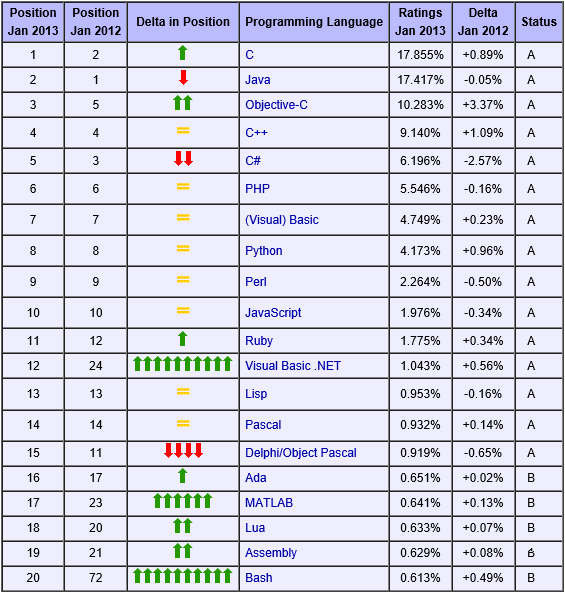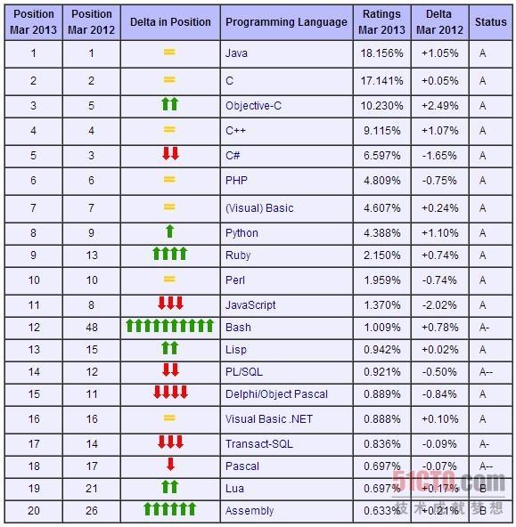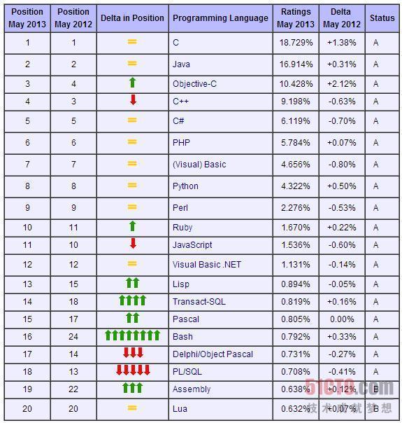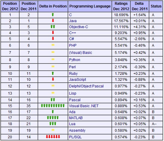 2012年11月6日,TIOBE公布最新一期编程语言排行榜。业界看到Objective-C蹿升势头良好,预测它即将蝉联年度编程语言排行榜的宝座。而C语言一直压制第二位的Java,并有差距越来越大的趋势。