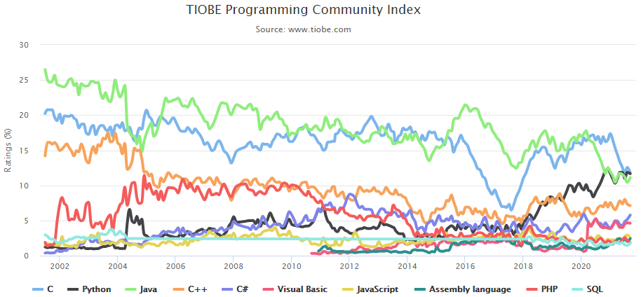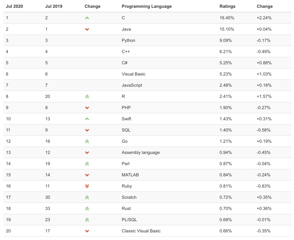 2020年11月Python曾短暂地与Java交换过第二名,本月(2021年5月)Python又杀到了这个位置。虽然差距只有0.11%,但是有理由认为这次Python会保住第二名的位置更长时间。再过半年,Python有可能会成为TIOBE排行榜的第一名,因为C(和Java类似)正在失去流行度。另外,Rust正在努力回到前20,Dart和Julia也在往上走。——Paul Jansen CEO TIOBE Software