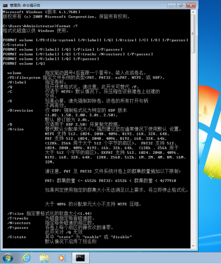 format 参数: /q 快速格式化 /u 不可恢复 /autotest 不提示 /s 创建 MS-DOS 引导盘 EXP:format c: /q /u /autotest 自动快速格式化C盘(危险!!!)